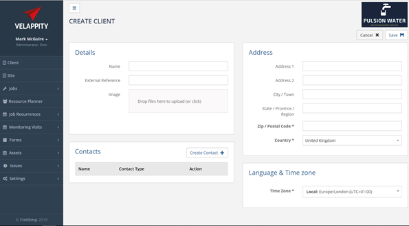 Once the time zone has been entered and all other data has been entered on the Create Client page, the client creation can be finalised by clicking the “Save” button.