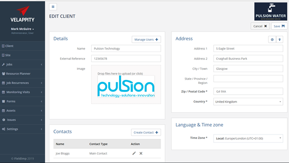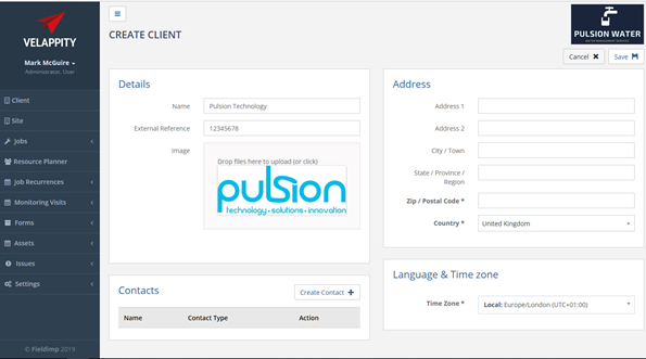 The user can fill out the Organisation Details with the name of the client organisation. This is a required field and is the name that will be used to refer to the client. An external reference can also be entered which must be unique to the client. This will uniquely identify the client in an external system and is used for system integration purposes generally. An image may also be provided by the user to give a visual representation of the client such as a logo. The image can be any common image file type such as a .jpg or .png file.