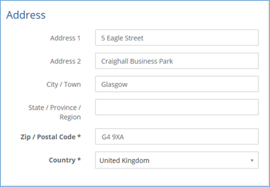 The user can then enter the address of the client. This can be entered through inputting the number and street etc. to the “Address 1” and “Address 2” fields. The city/town, state/province/region, postal/zip code and country should also be entered however it is not required that the user enter the state/province/region. The address should be the main address associated with the client, for example this could be the head office of the client.