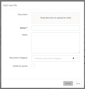 The user can drag and drop documents into the “Document” field of the page and can give a name for the document. The “Document Category” field is any tags the user wants the document to have. The document will be displayed under these tags in the client portal. If there are no tags added, then the document will be under an ‘uncategorised’ tag. To create a new tag please see the “Document Categories” section of this guide. If the “Visible on portal” checkbox is checked this means the document will be visible to all users on the Client Portal.