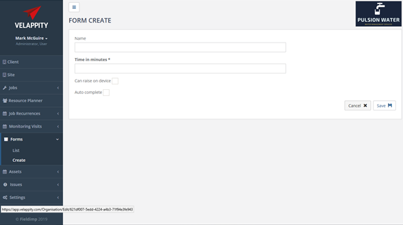 On the initial form creation page shown above, the name and time allotted can be entered. The name is essentially the name given to the form and it is the name that will appear in relation to the form and on mobile devices if the form is published. The time allotted is the time in minutes that the typical job, which uses this form, should take. This value can be changed when creating a job, however.