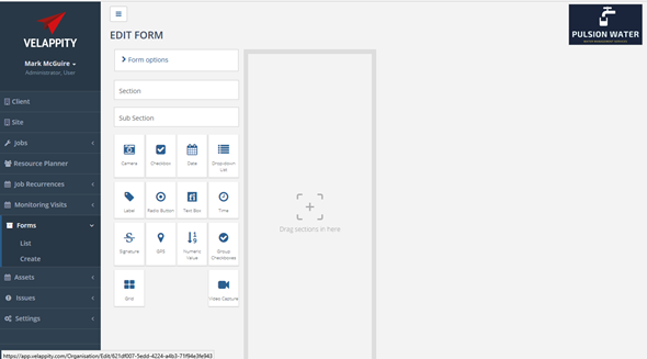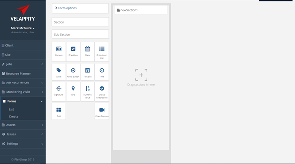 A Section can be added to the form by dragging the “Section” heading into the grey area marked “Drag sections in here”. This will then cause the new section to appear in this area. Forms in Velappity follow a hierarchical structure and sections encompass sub-sections and controls.
