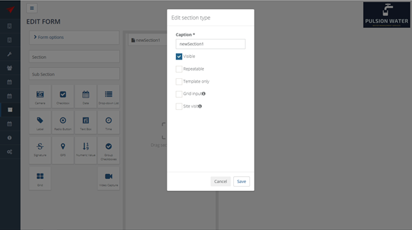 On the above pop-up, the user can change the caption of the section along with being able to decide whether the section is visible, repeatable template only and whether it is a Grid Input section. When the user is happy with the changes they have made, they should select the “Save” button to save the changes and return to the “Edit Form” page. Equally, the user could select the “Cancel” button which wouldn’t make the changes.
