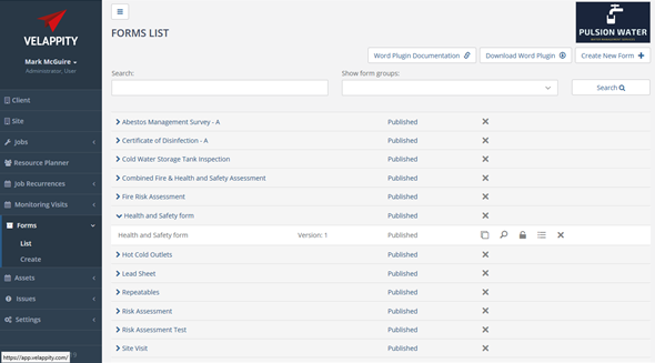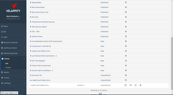 If there is a form in the Forms list which is no longer required and you would like to permanently remove it from your Velappity account, select the correct form and click the ‘Delete’ cross icon.