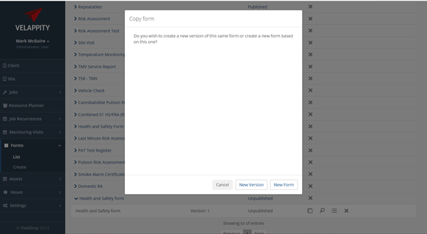 The user will then be asked if they wish to create a “New Version” of the form, a “New Form”, or to “Cancel” this task:
