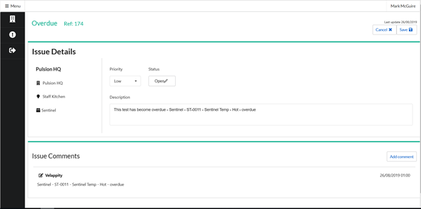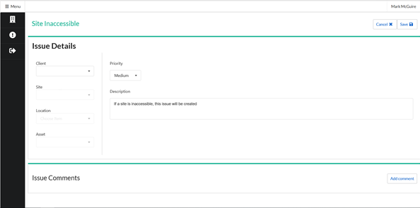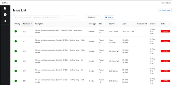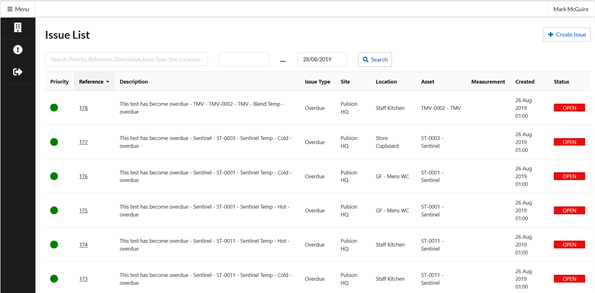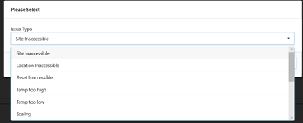 The “Issue Type” of an issue is a way to classify issues, for example scaling, temperature too low, overdue and location Inaccessible. The “Site” is site at which the asset with the issue is located. The “Location” is the location within the site where the asset with the issue can be found (e.g. Gents Toilet).