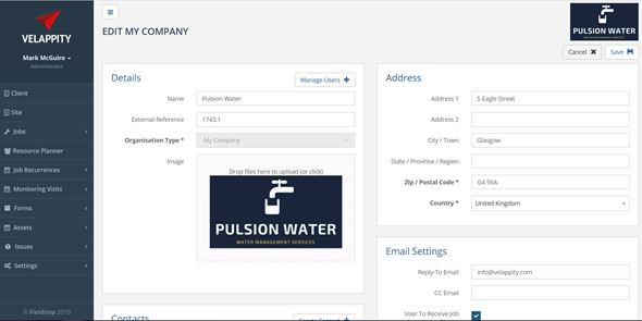 The “Organisation Type” field will automatically be set to My Company and won’t be able to be changed. The “Image” field is usually the company logo or a picture for the company, this is displayed at the top right of the page. The image can be any common image file type such as a .png or .jpg file.
