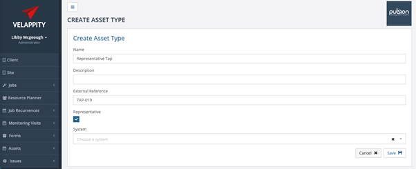 To create representative and sentinel outlets in Velappity, the user should make an asset type for each. Asset types are sentinel by default, to create a representative outlet the user should make sure the “Representative” checkbox is checked when they are creating the asset.