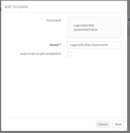 The user can then drag and drop files, in this case the user’s template, into the “Document” field. The user should then enter the name for the document into the “Name” field i.e. Legionella Risk Assessment. The user can also choose whether to email this document to the client after completion of the job. If “Auto Email on Job Completion” is selected then any jobs completed with this template will have the job report emailed to the client contact automatically on reaching the status of complete.