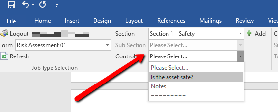 Now that a Form has been selected, you can select what content you want to be added to the document. First select the Section (& Sub Section if used) from the Section & Sub Section drop-downs. Then select the control to add from the bottom Control drop-down.