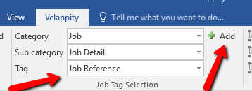 This section of the ribbon allows you to create tags in the template using additional details about a Job, Client or Site which are stored on Velappity. Again, you can select the exact tag and then, with the cursor where you want the tag inserted, click the Add button to create the tag.