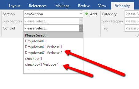 If Verbose Values have been set up on a Control they will be selectable as individual items from the Control drop-down in the Word Extension. When inserted to the template as a tag they will insert the text entered for that Verbose Value on the Velappity website rather than the data entered to the Control.